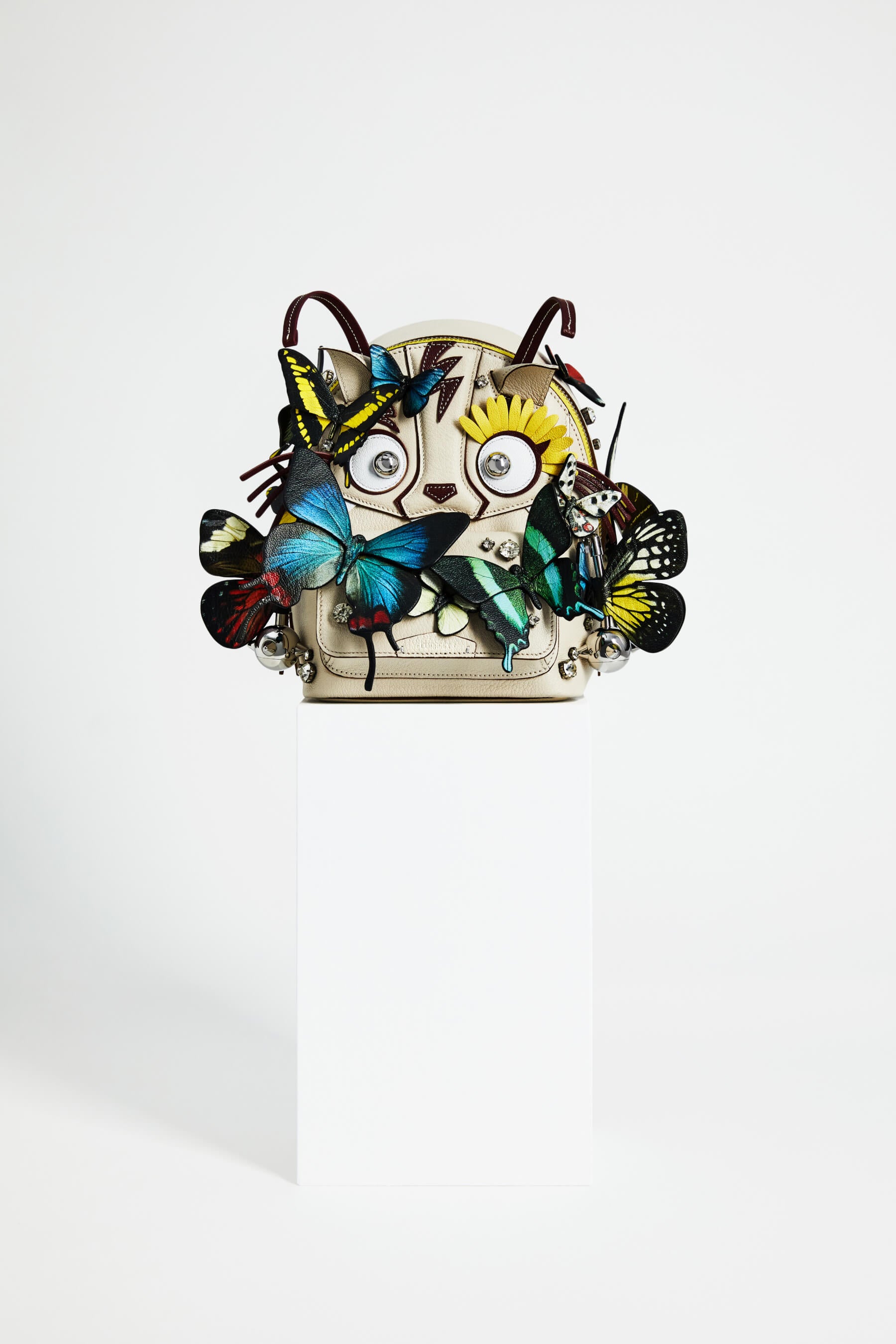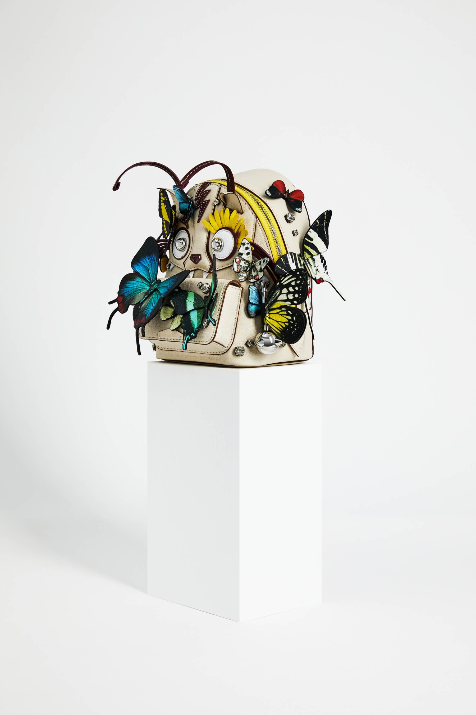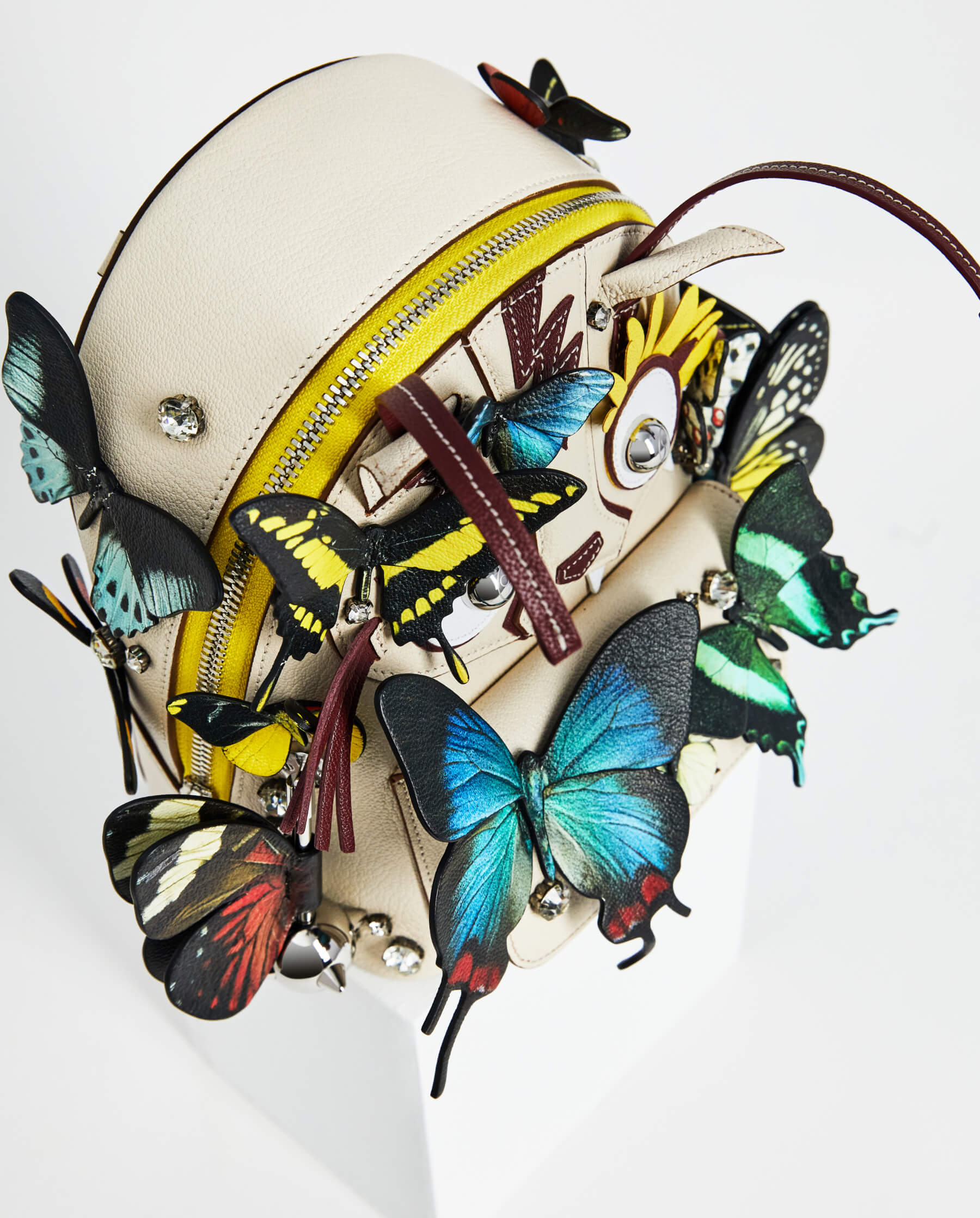 Crème de la Crème is massively inspired by one of my most admired artists, Damien Hirst’s series of opulent butterfly monochrome paintings entitled ‘Midas and the Infinite’ created for the Sotheby's auction ‘Beautiful Inside My Head Forever’ in 2008. Layered with metaphors, Crème de la Crème, similar to Hirst’s original, is also made up of a panoply of different butterfly species - some large, some small, some elaborately printed, others mottled. The juxtaposition of the exuberant hues of the digitally printed butterflies’ gossamer wings set on an idiosyncratic anthropomorphic creamy white leather bag induces awe and contemplation, oscillating between adorable and curious.