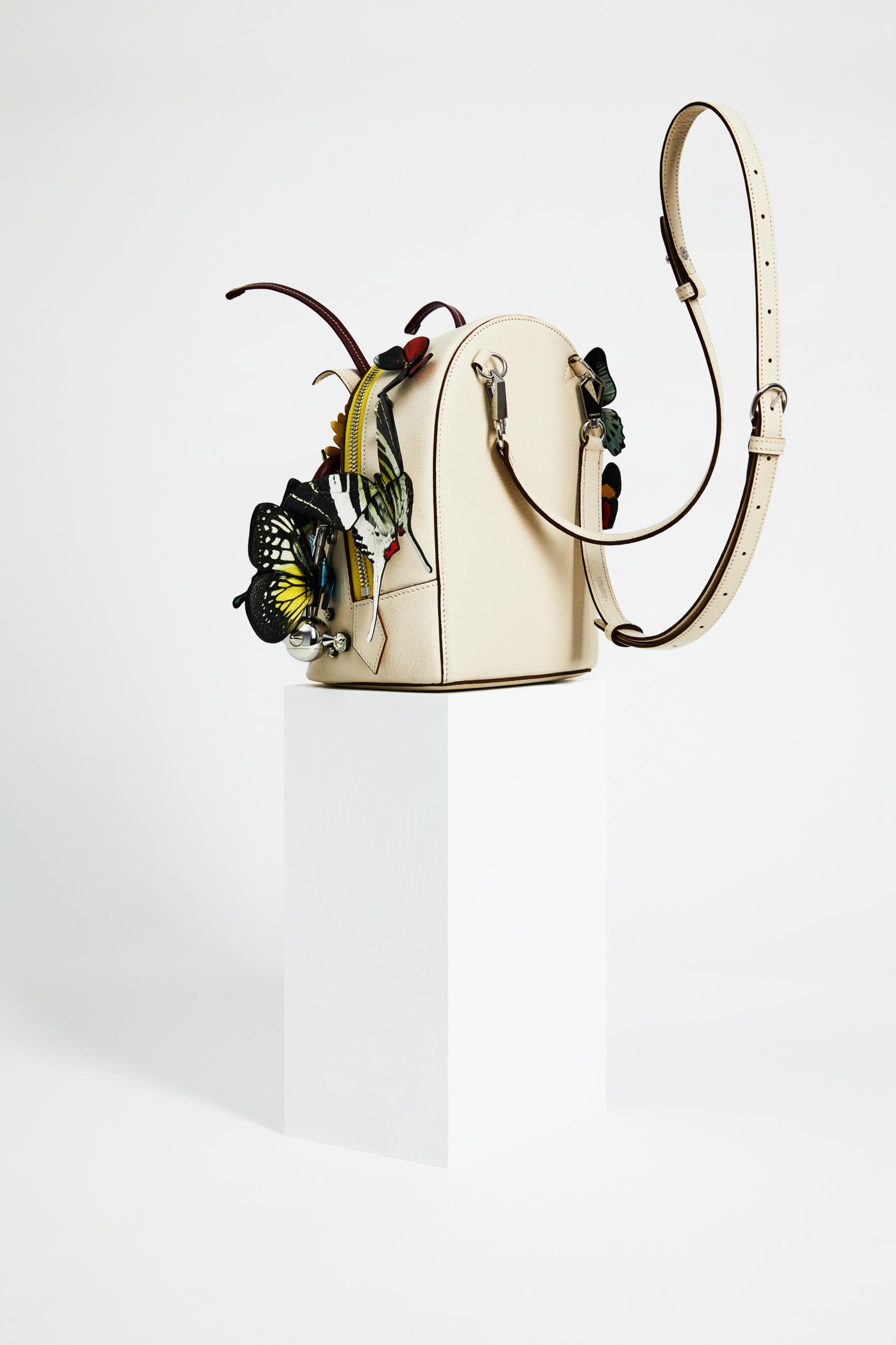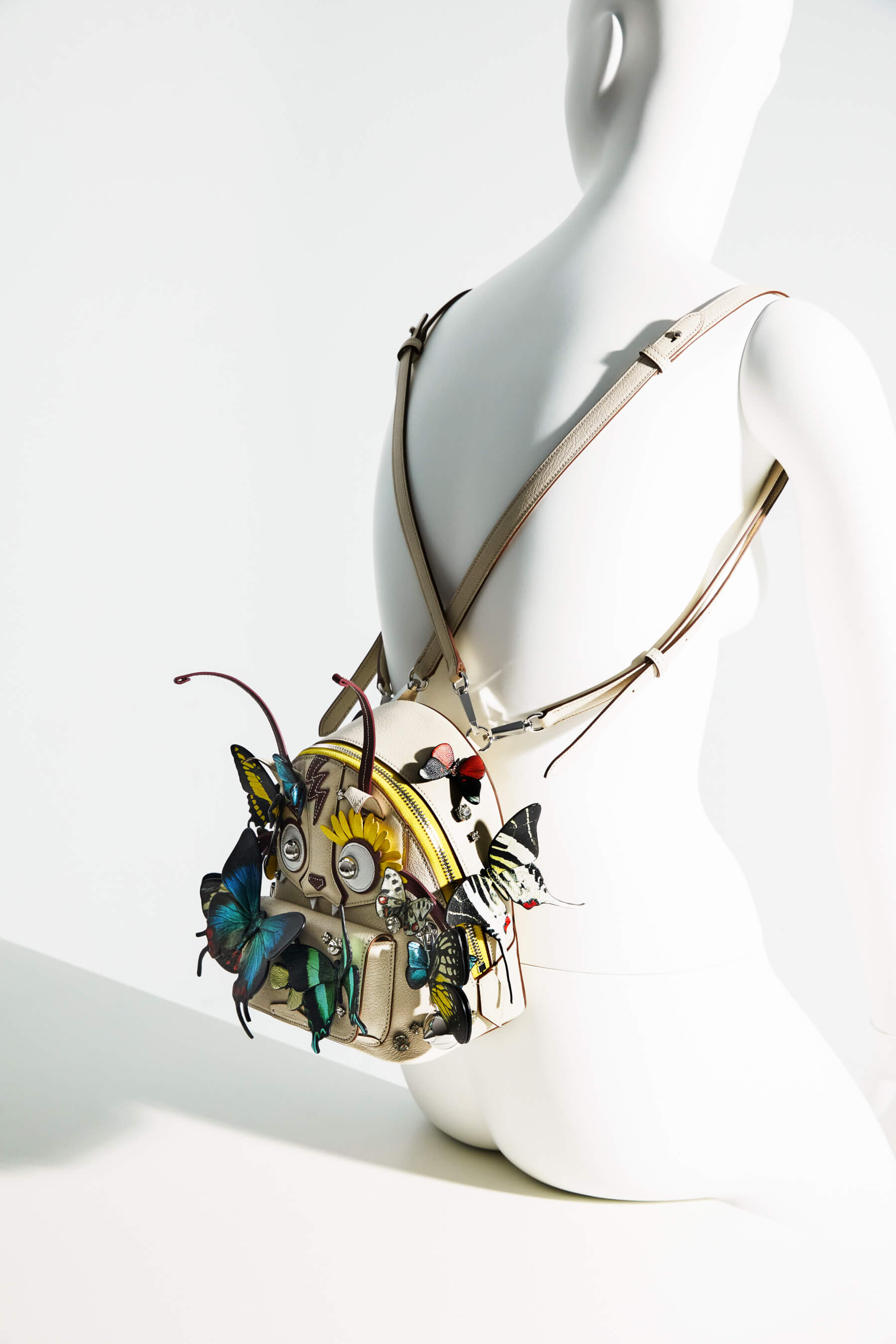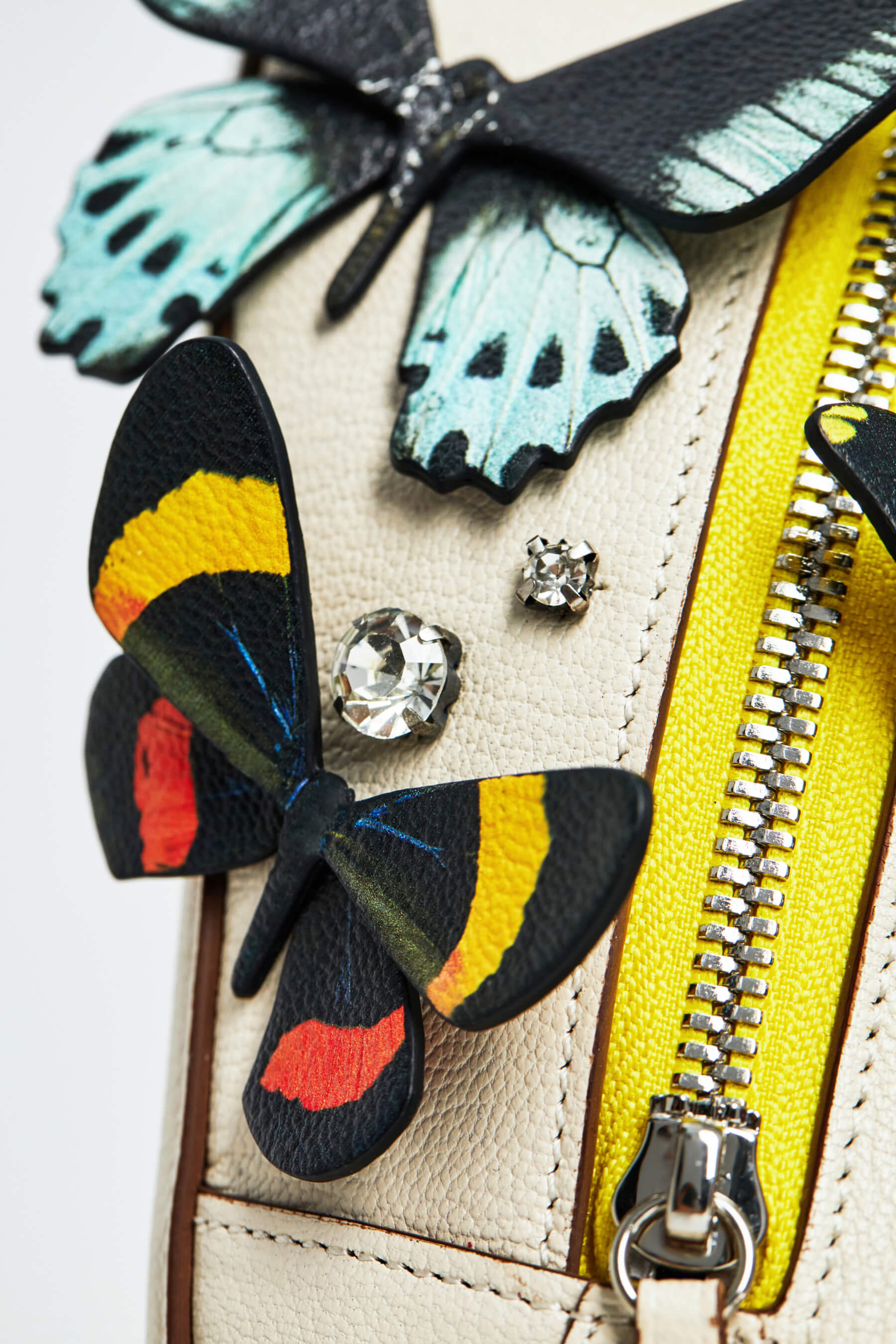Crème de la Crème is massively inspired by one of my most admired artists, Damien Hirst’s series of opulent butterfly monochrome paintings entitled ‘Midas and the Infinite’ created for the Sotheby's auction ‘Beautiful Inside My Head Forever’ in 2008. Layered with metaphors, Crème de la Crème, similar to Hirst’s original, is also made up of a panoply of different butterfly species - some large, some small, some elaborately printed, others mottled. The juxtaposition of the exuberant hues of the digitally printed butterflies’ gossamer wings set on an idiosyncratic anthropomorphic creamy white leather bag induces awe and contemplation, oscillating between adorable and curious.